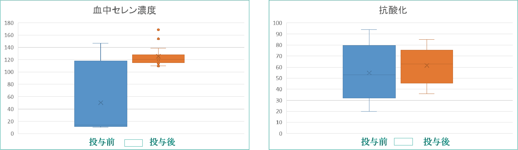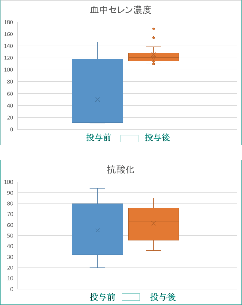 その中で血中セレン、抗酸化力が投与前と比較し、有意に上昇しており、重金属トータル毒性の明らかな低下も確認しています。