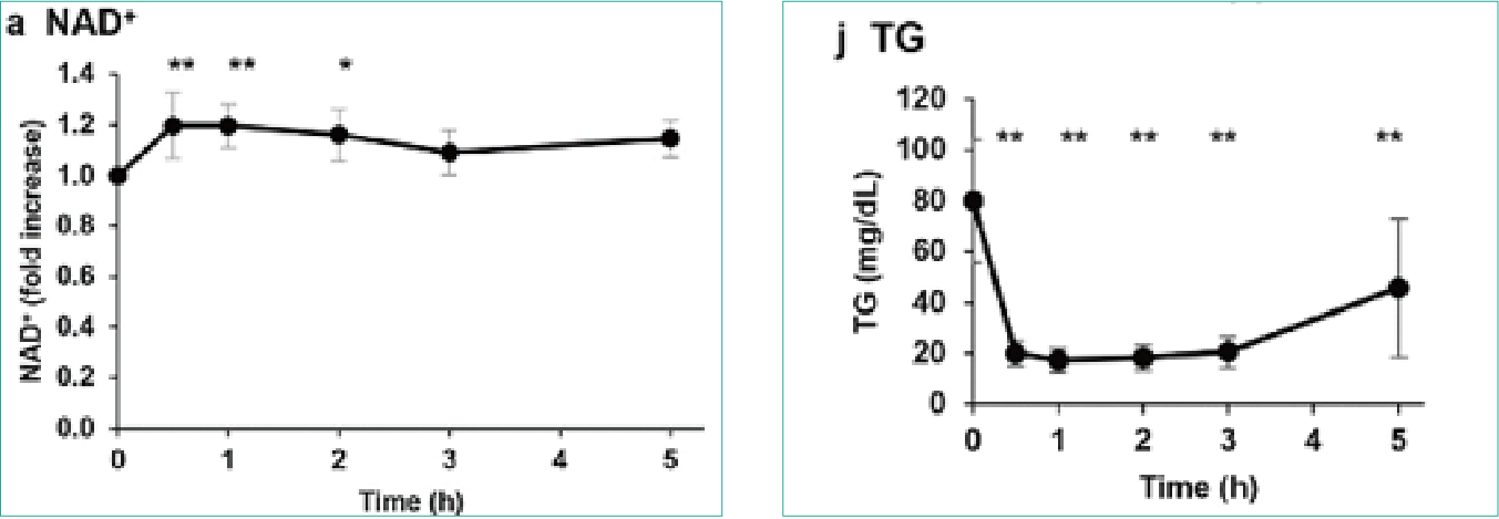 「ニコチンアミドモノヌクレオチド(NMN)は安全に代謝され、健康な人の血中中性脂肪値を大幅に低下させる。」